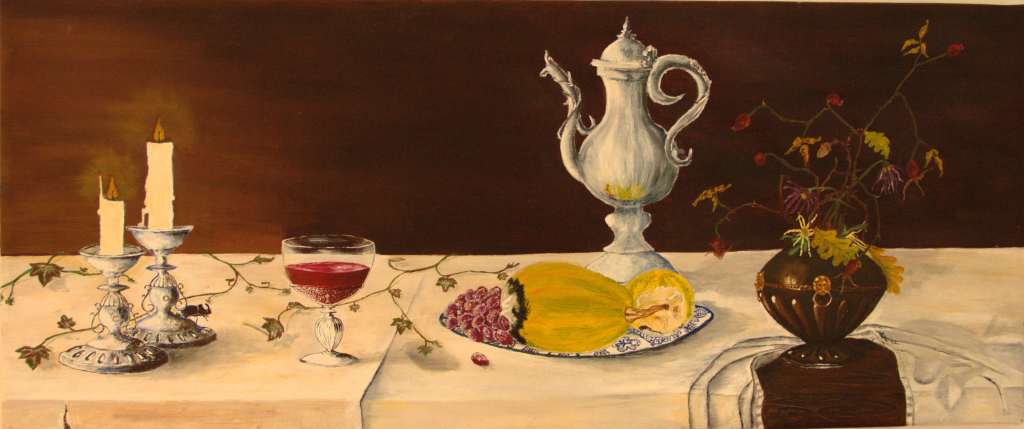 Till vårt ”finrum” med stora matsalsbordet ville jag därför måla en tavla som vid första anblicken föreställde ett dukat bord, men vid närmare betraktelse skulle man lägga märke till ett förfall. Jag sköte kunskap om olika vanitasmotiv och vanliga symboler och funderade på hur jag kunde använda dem i min tavla. Sedan kom arbetet. Det var en långsam och prövande process. Jag lärde mig massor om oljetekniken och mitt eget skapande. Efter 60 timmar var tavlan klar.