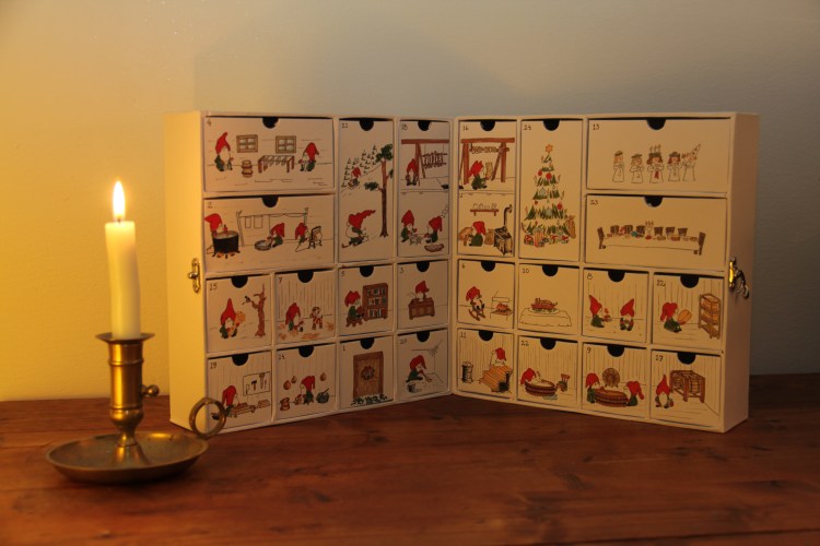 Paketkalender med 24 lådor 950 kr. Handmålad, avvikelser från bilden förekommer. Beställningsvara minst 21 dagar eller enligt överenskommelse. Mått: 52×26×6,5 cm